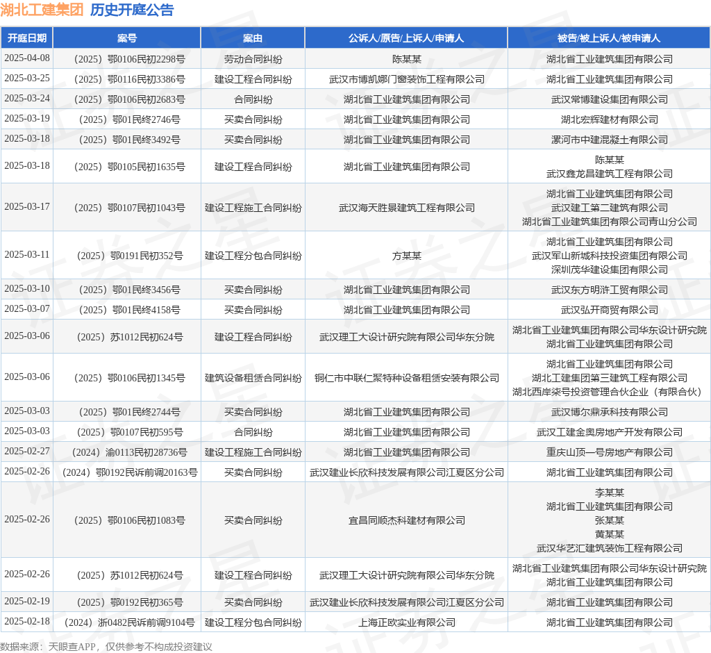 本站消息,根据天眼查APP显示,近日公布了一则湖北省工业建筑集团有限公司作为被告/被上诉人的开庭公告,详细内容如下:
